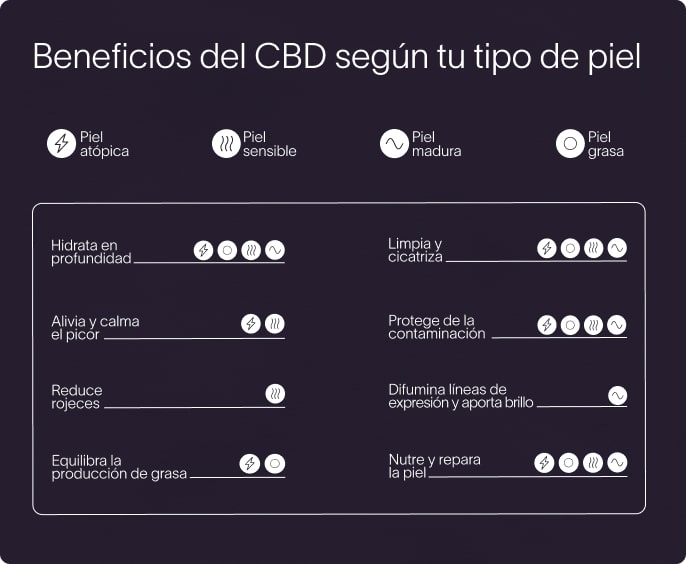 La acción seborreguladora y limpiadora del CBD puede ayudar a mejorar la apariencia de la piel, recuperar su equilibrio y reducir la aparición de granitos, puntos negros. - Para pieles maduras: