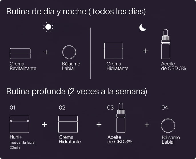 02 Hidratamos la piel de forma diaria con Crema dermo-reguladora de CBD o la Crema Revitalizante y para un boost de nutrición en pieles secas y sensibles sellamos con un poco de Aceite de CBD 3%.